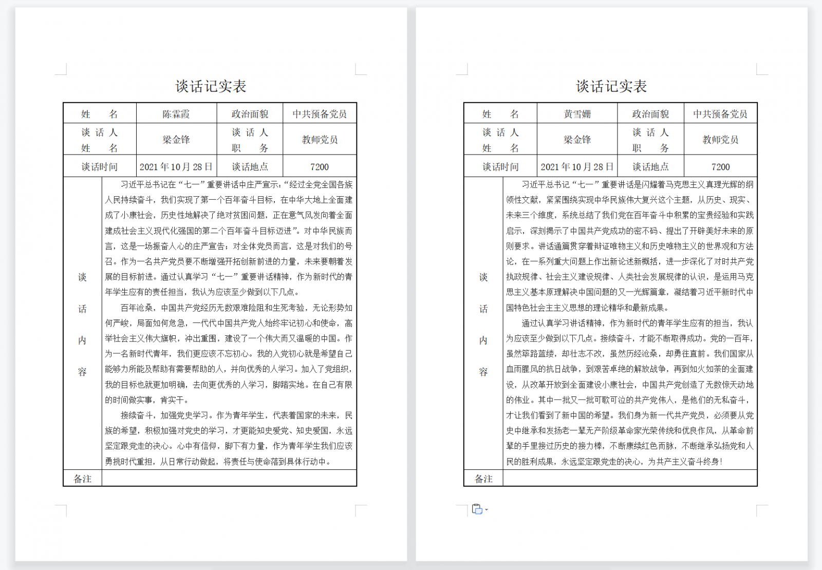 党员教师李彩云老师进行培养人谈话,主题为:思想汇报和党史学习心得分享。