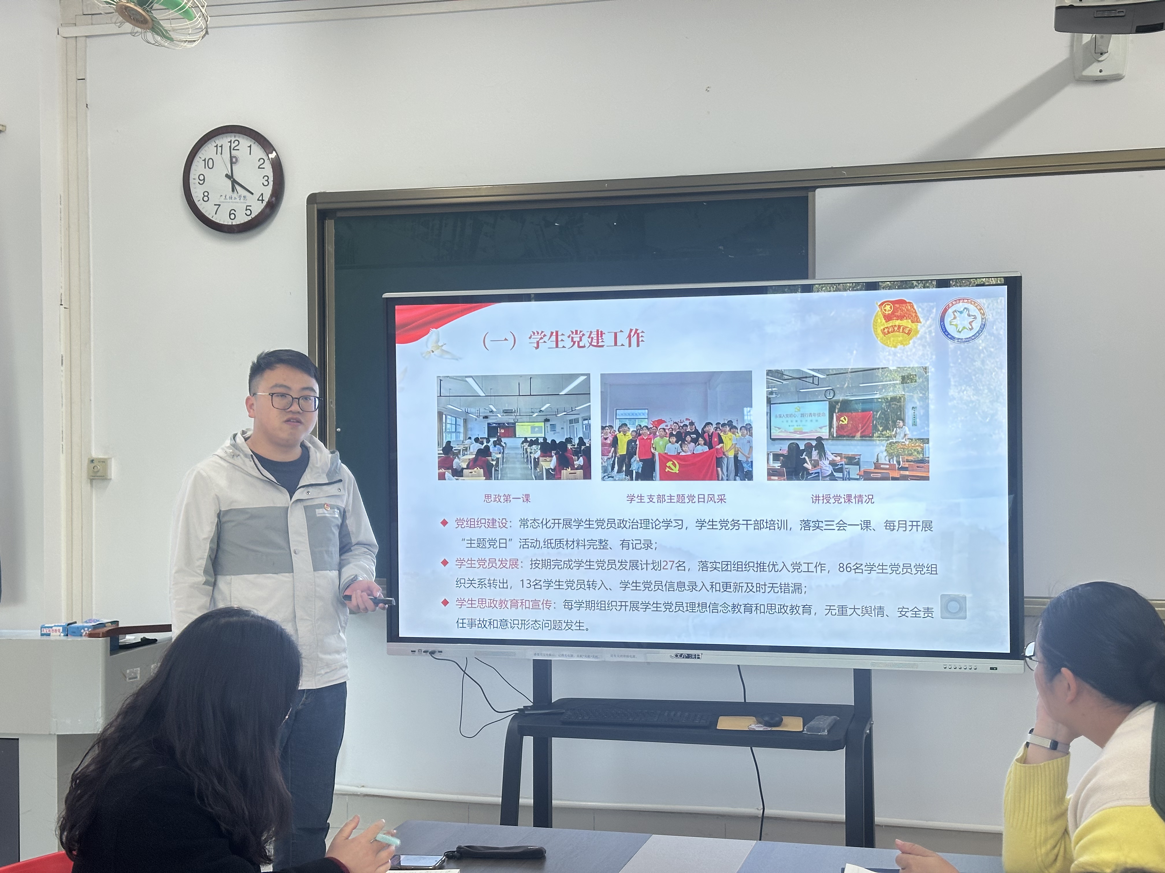 学生第一党支部书记陈彦霖汇报了本学年学生第一党支部的主要工作开展情况,回顾了本学年“三会一课”情况、党员教育情况、党员发展情况,指出要狠抓支部上课落实到位情况,严格按党章发展党员原则,扎实做好理论学习教育工作,提出下学年要更进一步带动支部成员的积极性,发挥好基层党支部的作用。