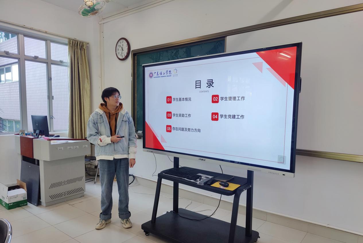 会议伊始,梁金锋副书记就本学期学生党团建设、班级管理、宿舍管理、学风建设、安全教育和专业竞赛等方面进行了简要汇报。随后,各辅导员对本学期学生管理、模块工作进行了详细汇报,分享了各模块工作中的成效和亮点,同时就学生工作中存在的不足提出了相应的措施和计划。