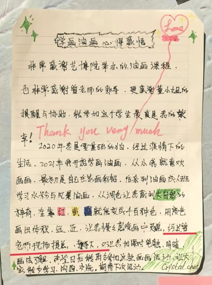经过一年的学习,学员在公益课程中学习掌握油画的基本技法,包括构图的处理、色彩的把握、色调的把控、笔触的运用和肌理的制作等,创作出不少精彩油画作品。作品展示了学员们对油画课程的理解与实际运用,记录了他们为提升艺术修养的成长与进步。