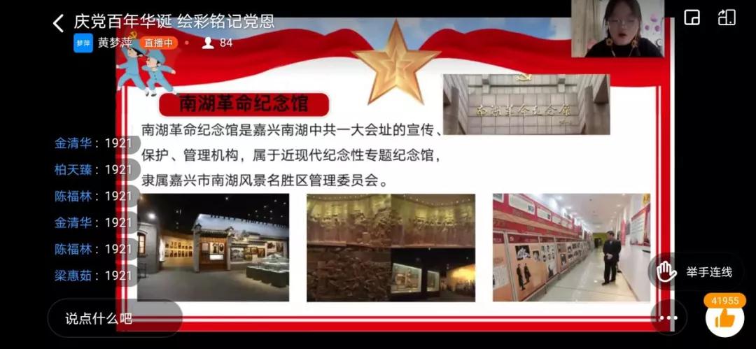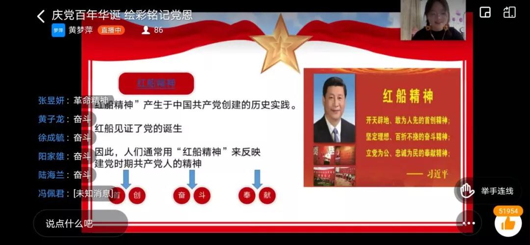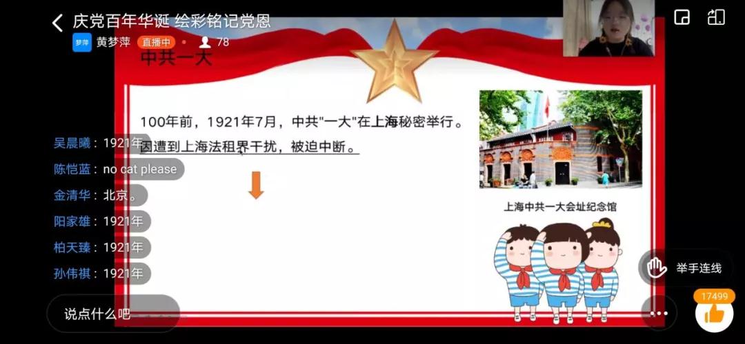 黄梦萍同学先以一艘小船的故事引入建党100周年的话题,带领大家走近这艘红船,吸引小朋友们的学习兴趣。