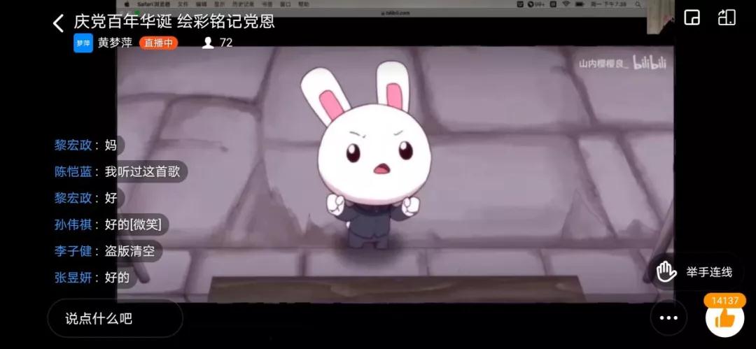 在课上,黄梦萍同学播放了一段小小的动画片,《那年那兔那些事儿》,带领同学们走近红船。抓住动画片里面的百年红船形象,引进了中共一大的故事,采用提问、抢答等方式,与同学们进行有趣的互动。