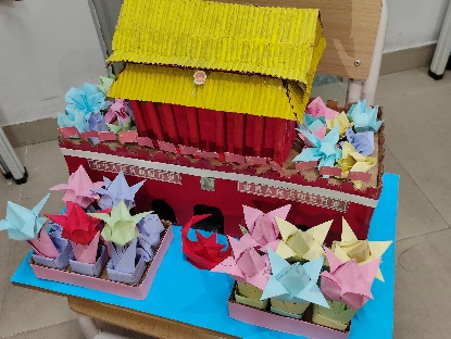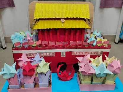 此作品以纸箱、折纸、纸巾为主要材料,通过巧妙的剪裁、折叠和装饰,将废弃材料转化为具有中国元素的精美作品。这不仅体现了废物利用、环保节能的理念,还通过纸箱的再利用,传递了珍惜资源、保护环境的价值观。