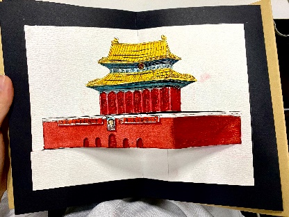 此作品以红金为主色调,绘画“75 周年”大字与龙。抽拉照片册展示历史,立体国旗沿辉煌璀璨道路移动,介绍新中国成立以来的重大事件成就,最后立体呈现北京天安门,展现中华人民共和国成立 75 年辉煌。