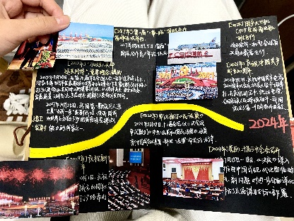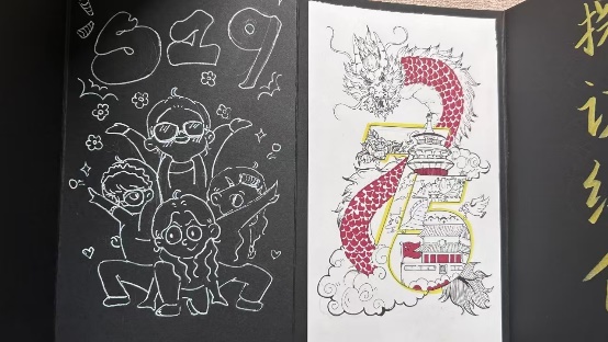 此作品运用了中国非遗文化的漂漆技术制作手帐封面,内页绘制了长城并结合了新中国成立75周年以来的重大历史事件,张贴在长城上,代表长城连绵不绝,也代表着中华人民共和国将会越走越繁荣。