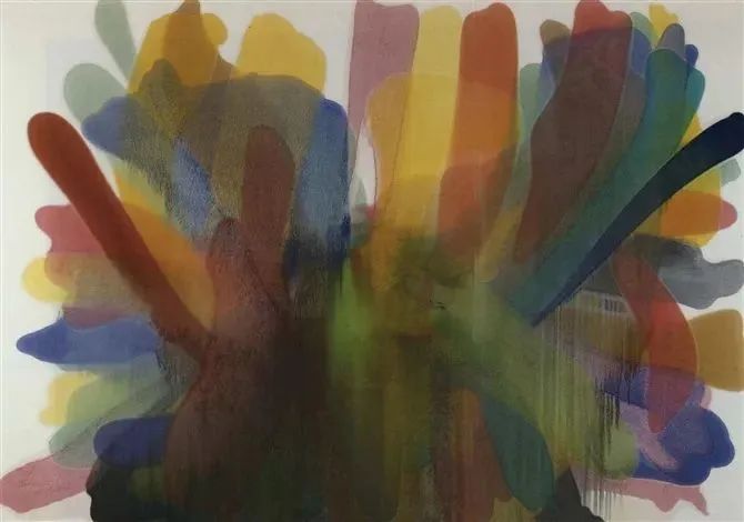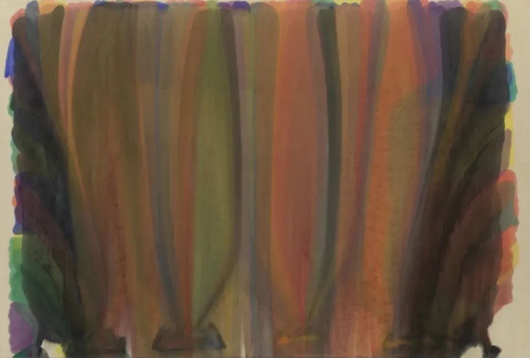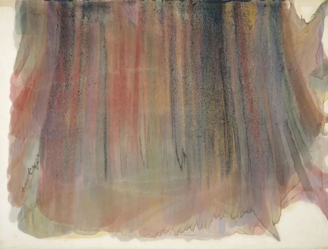 1957年莫里斯在纽约玛莎杰克逊画廊(Martha Jackson Gallery)举办了首次个展。当尺寸巨大的作品被挂到墙面上,那些色彩流淌的痕迹就像一些五彩缤纷、向上生长的热带植物。而那些观赏的人体验一种流动感,这种效果来自于液体颜料在画布上的自然流淌、律动的色彩在画的两边倾斜流淌,空出大片的空白。一种动人的力量,陷入沉思。
