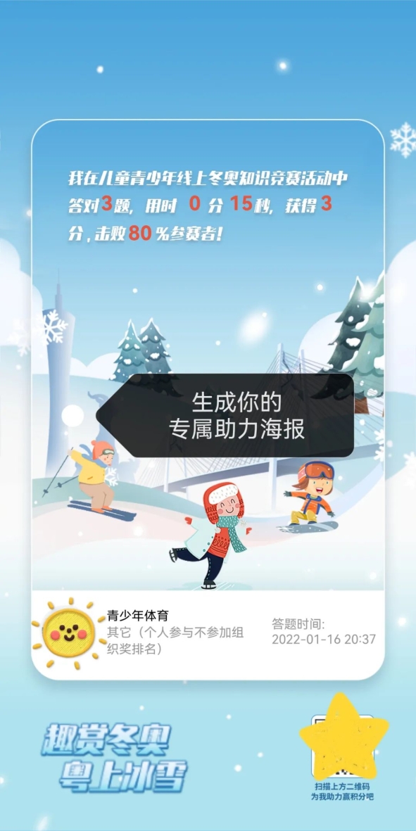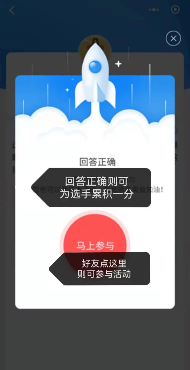 2.好友参与答题助力:好友收到助力邀请后,扫描海报上的二维码,根据提示进入系统答题,每次1题,答对加1分,答错或超时不扣分。(每个好友活动期间仅可为同一选手助力一次,答对或答错都算作已助力)