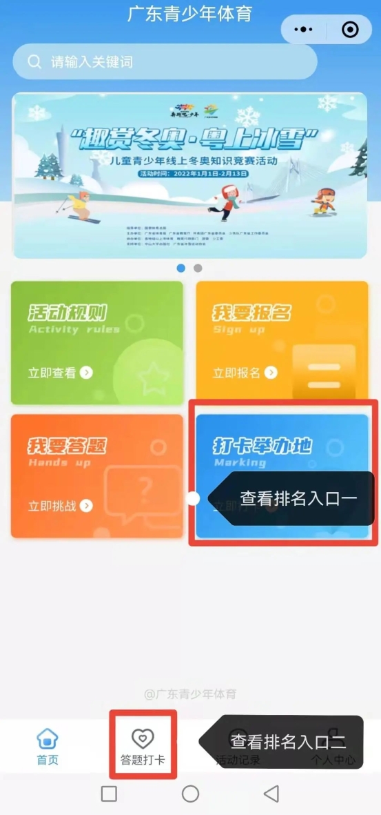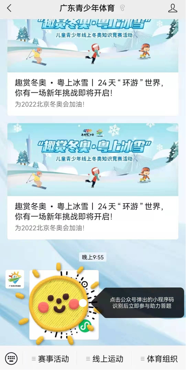 2.从2022年1月17日至活动结束前,微信搜一搜“广东青少年体育”,关注微信公众号后直接点击菜单栏上的“线上运动”-“趣赏冬奥粤上冰雪”进入活动页面填写个人信息,并参与答题打卡。