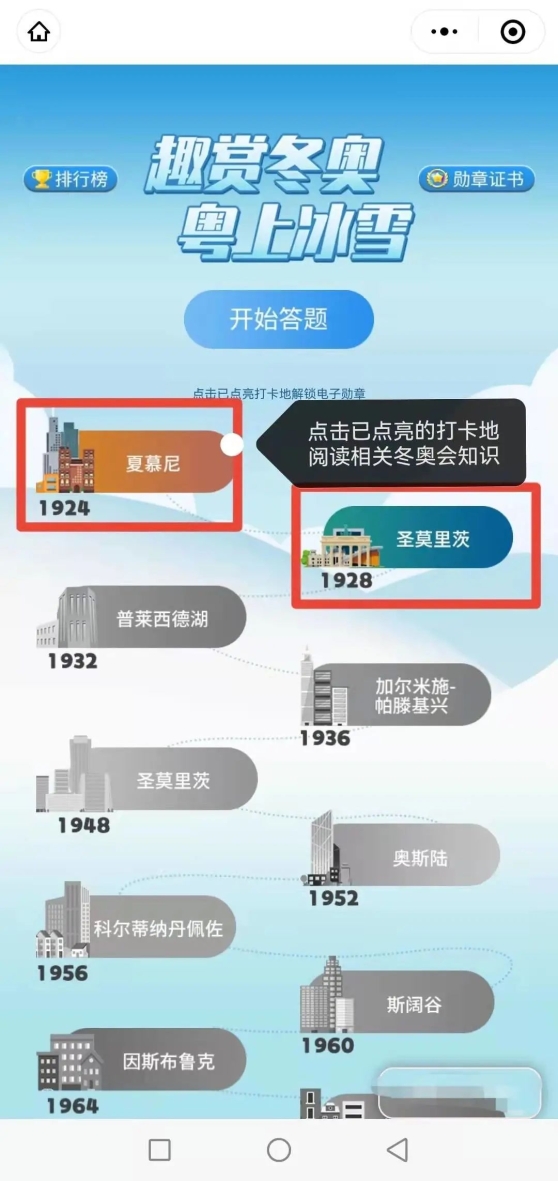 1.点亮举办地:活动页面设置1924年夏慕尼冬奥会到2022年北京冬奥会共24个线上虚拟打卡点,选手当天参与答题+好友助力,积分达到3分及以上,系统按顺序自动点亮一个冬奥举办地,即为打卡成功,可前往首页“打卡举办地”或“答题打卡”查看点亮情况。
