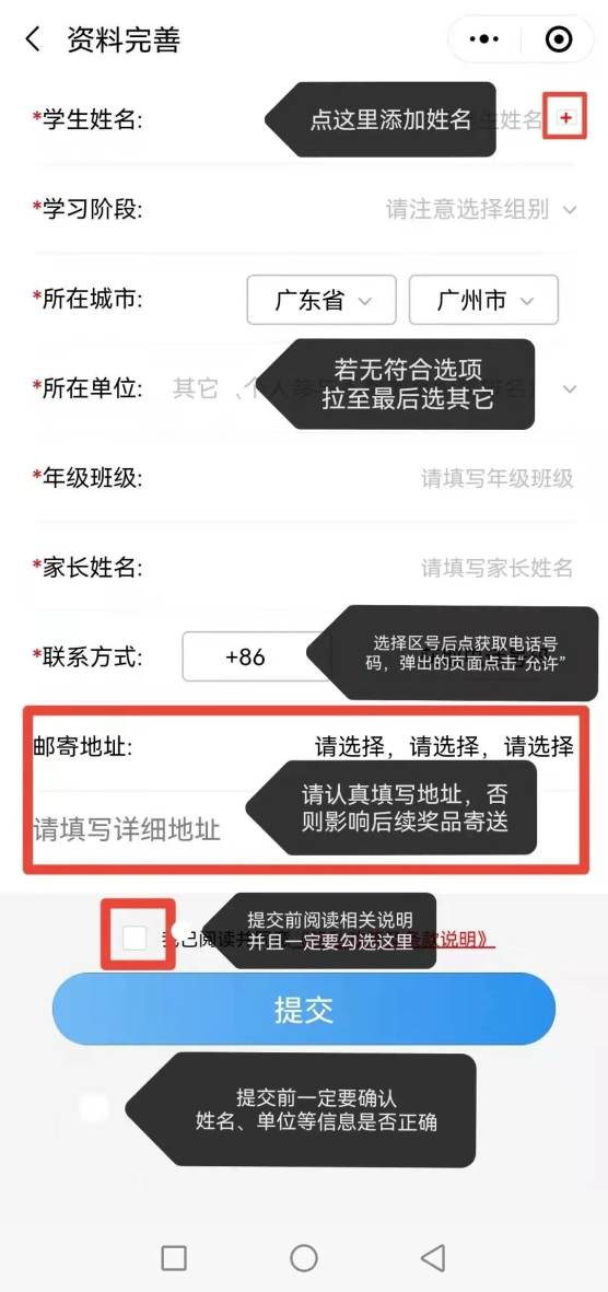 温馨提示:同一微信号最多可填写3位选手的姓名,学习阶段、所在单位、班级年级默认首位选手的信息,证书署名及实物奖励按照一个微信号发放一份,一经提交个人资料,不可变更。何进行答题挑战