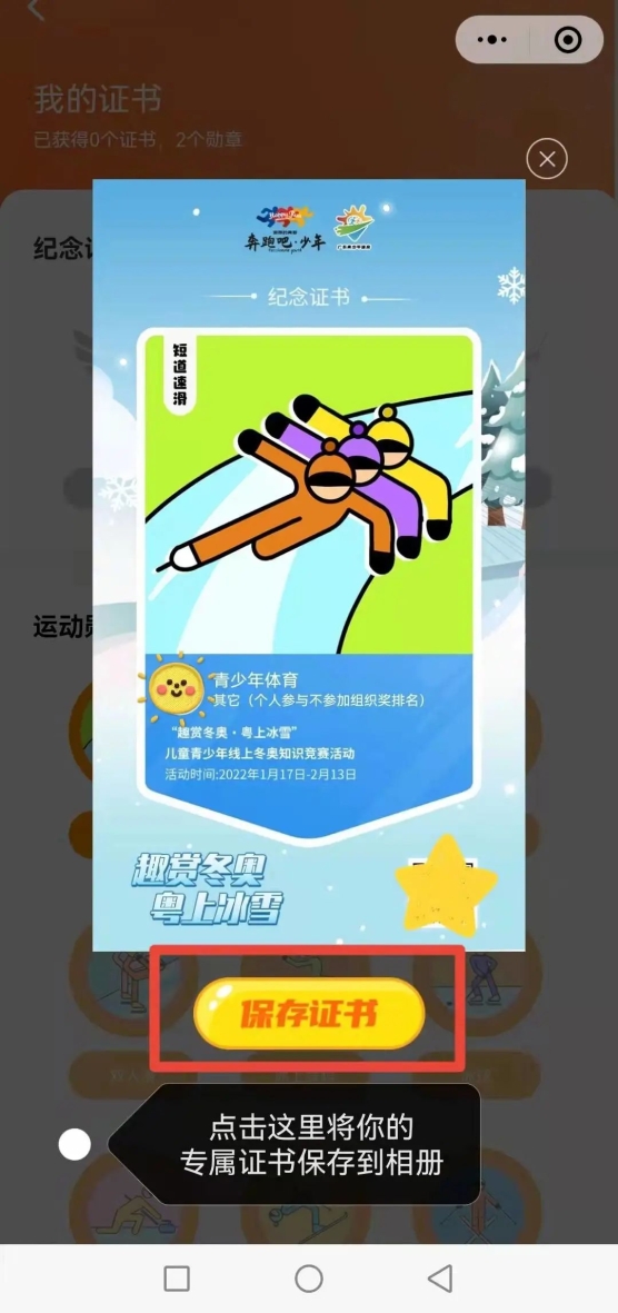 在活动截止前,完成点亮第12个线上虚拟打卡点的选手,将获得“冬奥知识小达人”电子纪念证书