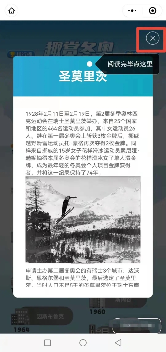 2.解锁电子勋章:点击已点亮的线上虚拟打卡点图标,会弹出相应届数的冬奥会趣味知识介绍(这里也是考点哦),阅读完毕可解锁一枚绘有冬奥代表性运动项目图案的电子纪念勋章。