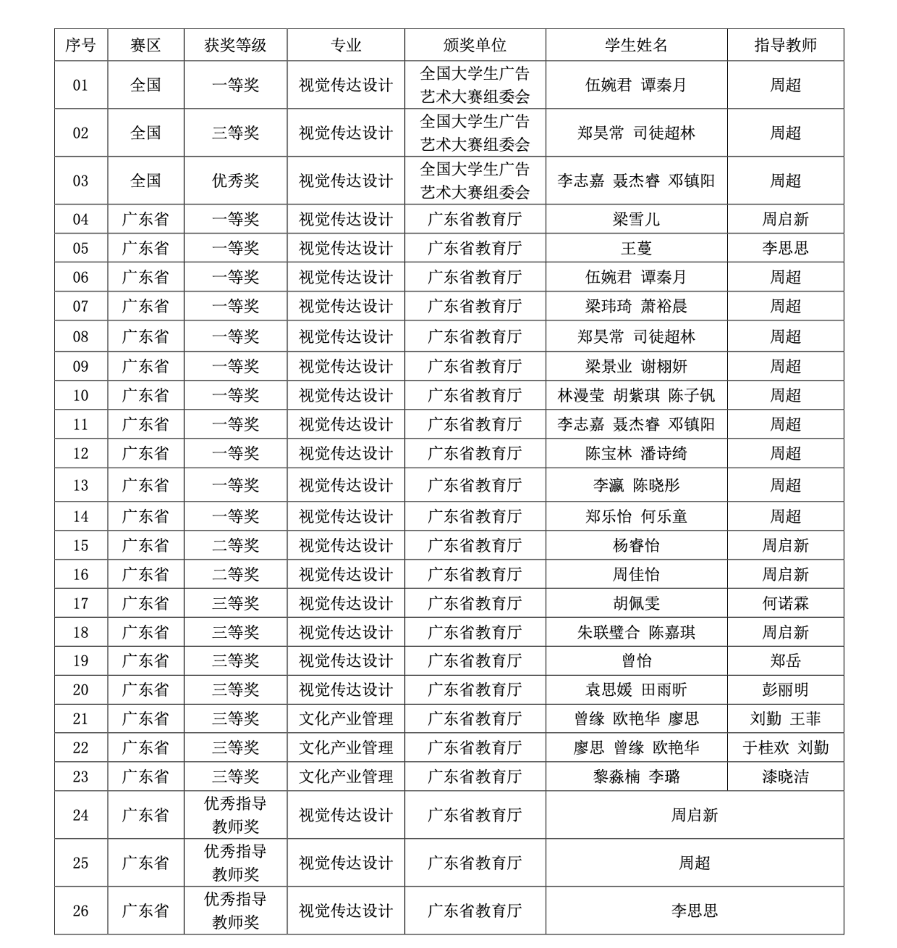 本网讯(彭丽明)近日,艺术学院视觉传达设计(简称 “视传”)与文化产业管理(简称 “文管”)专业学子在第17届全国大学生广告艺术大赛(简称 “大广赛”)中再续辉煌,共荣获国家级一等奖1项、三等奖1项、优秀奖1项,广东省赛区一等奖11项、二等奖2项、三等奖7项,以及“优秀指导教师奖”3项(省赛区证书由广东省教育厅盖章颁发),总计26项重磅奖项,不仅延续了我院在该项赛事中的优良竞技传统,更以亮眼成绩凸显了教学实力与前沿技术教学的显著成效。