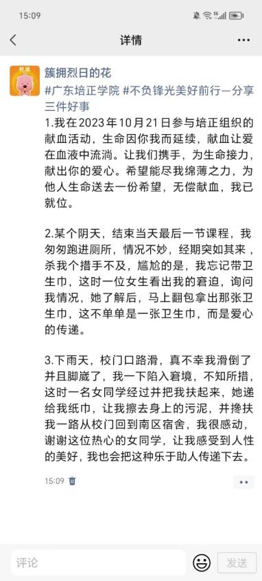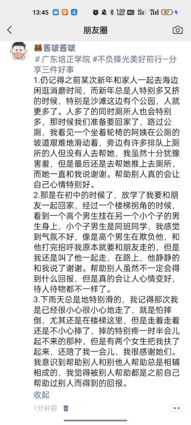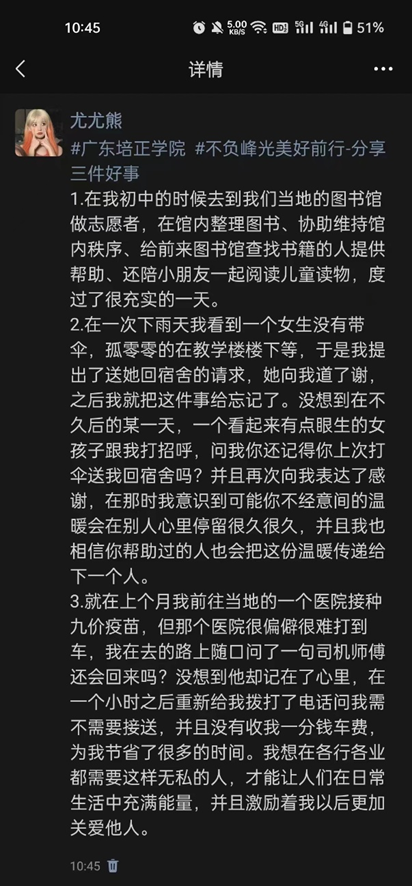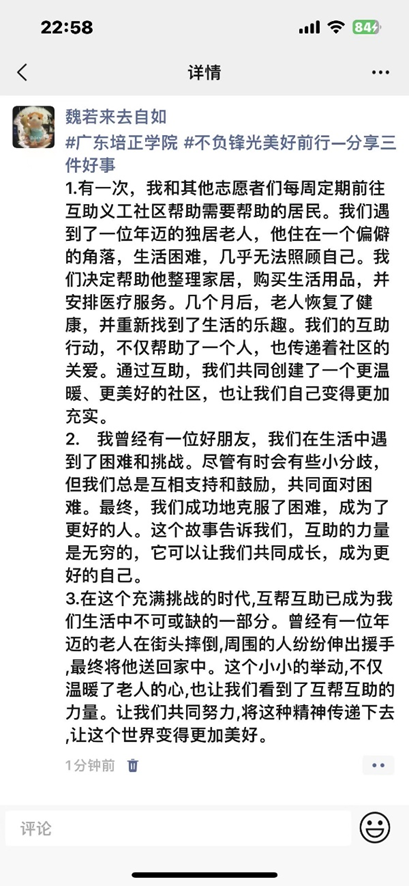 通过一次分享,不仅增进了同学们对身边同学的了解,还互相传递了正能量,提升参与者的幸福感。这使我们学会了用积极乐观的心态更加有信心勇气面对生活面对困难,关注身边的幸福时刻。同时,活动也提醒我们要珍惜生活中的小确幸,包括与家人的温馨时光、工作上的成就、对他人的帮助等,感恩所拥有的一切。在未来的日子里,希望我们能继续保持这种分享好事的习惯,将积极能量传递给更多的人。让我们共同努力,创造一个充满爱与温暖的环境。