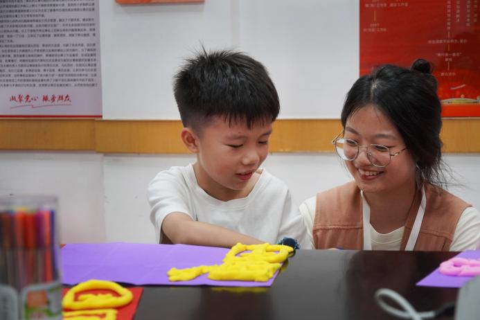 在甲骨文黏土体验之旅中,小朋友先选好喜欢的黏土颜色,充分发挥想象力和动手能力,学着用“揉、捏、压”等手法,在卡纸上全神贯注地创作,他们有的将粘土搓成细细的线条,勾勒甲骨文的轮廓;有的把粘土捏成不同形状,填充在文字笔画之间。在创作过程中,队员们穿梭其中,耐心指导,为小朋友答疑解惑,现场氛围轻松而热烈。