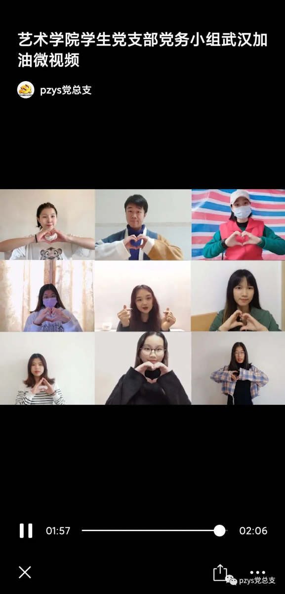 “云党建”,勇担使命守初心。2月份,我院学生党支部通过线上开展了一系列的党建活动:拍摄“艺心战“疫”|心系荆楚千万里,为爱发声携手行”的主题打气视频;组织开展党员疫情防控自愿捐款,携手互助,共同抗疫;组织新冠疫情科普知识,积极开展志愿服务;在疫情防控期间组织收集积极参与各地防控志愿服务的党员优秀事迹,加强党性宣传。
