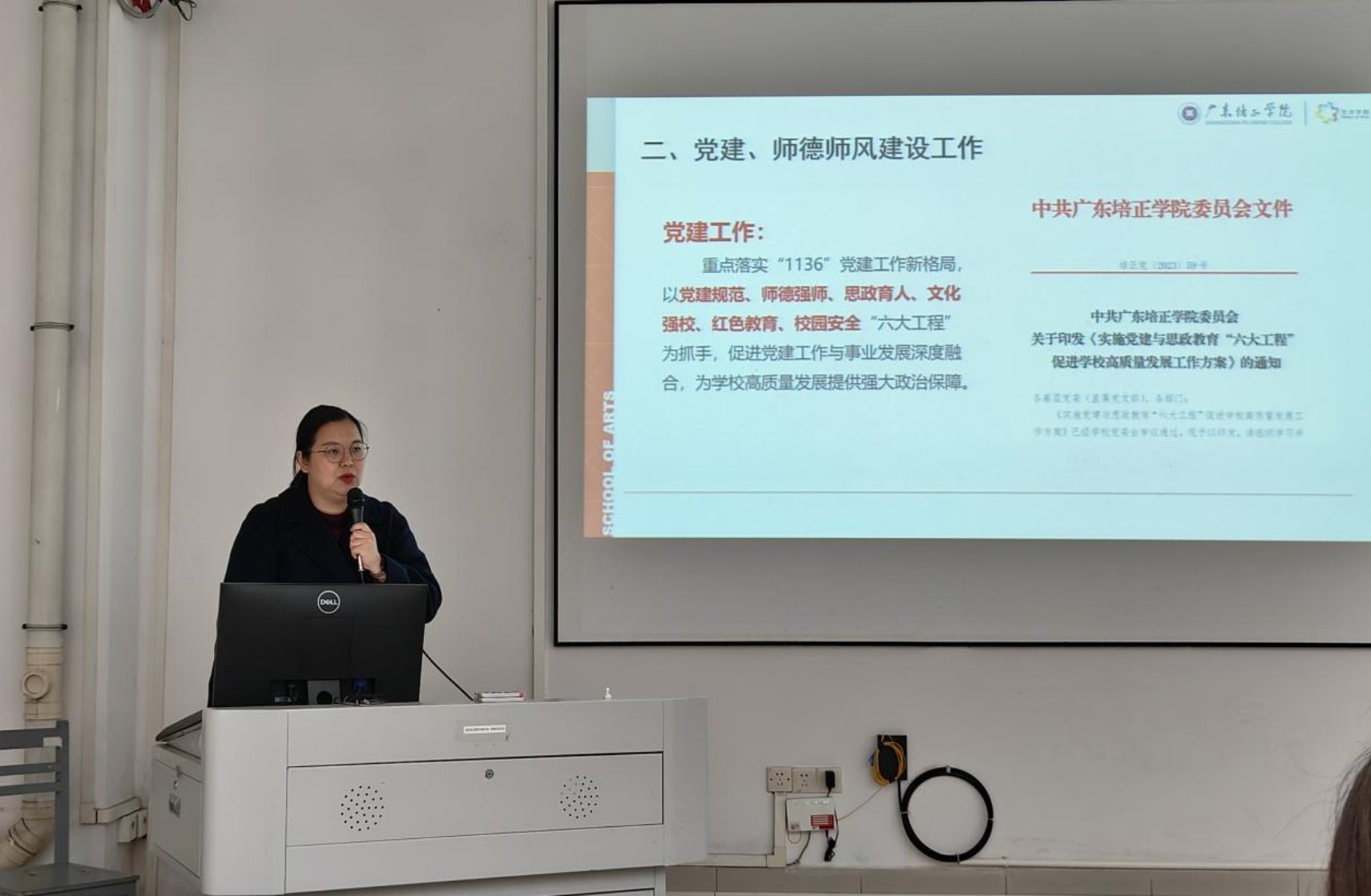 随后,艺术学院教学副院长王海宾也进行了工作汇报。她首先总结了上一学期教育教学工作的主要成就,同时也指出了存在的短板与弱项,如青年教师课堂教育教学能力、产学研成果等方面还有待提升。基于此情况,她提出了本学期的工作重点,包括推进课堂教学改革、加强毕业论文和实习指导工作以及促进科研创作和学科专业特色发展等。