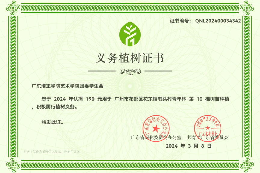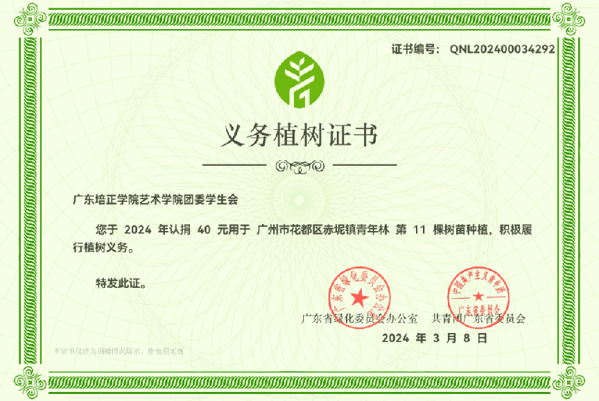 “绿美广东,首要在绿”。为了深入贯彻生态文明思想,重要指示精神,助力绿美广东生态建设。3月20日,广东培正学院艺术学院团委学生会,在广州市花都区花东镇港头村青年林和赤坭镇青年林分别认捐树苗一棵。