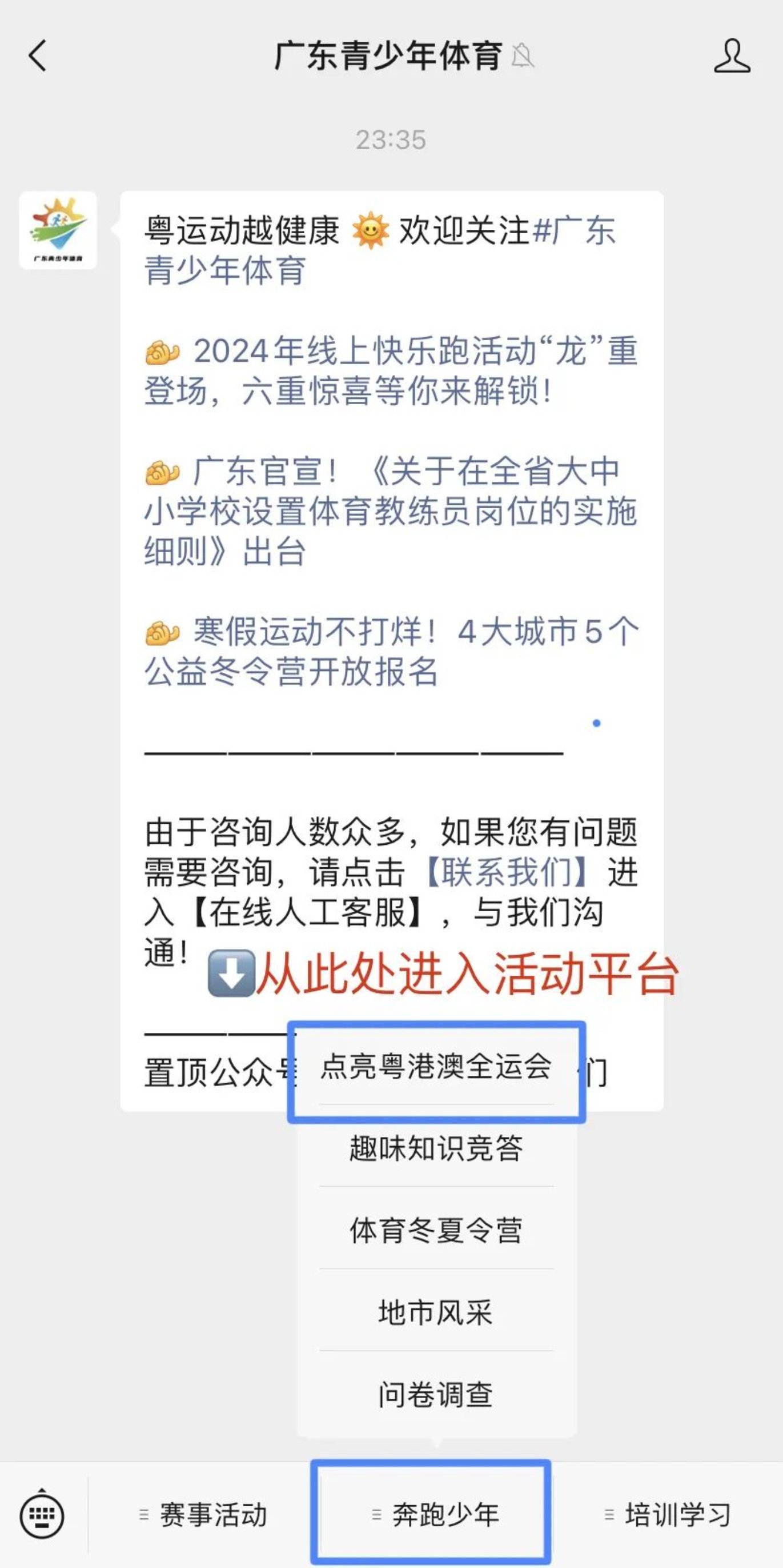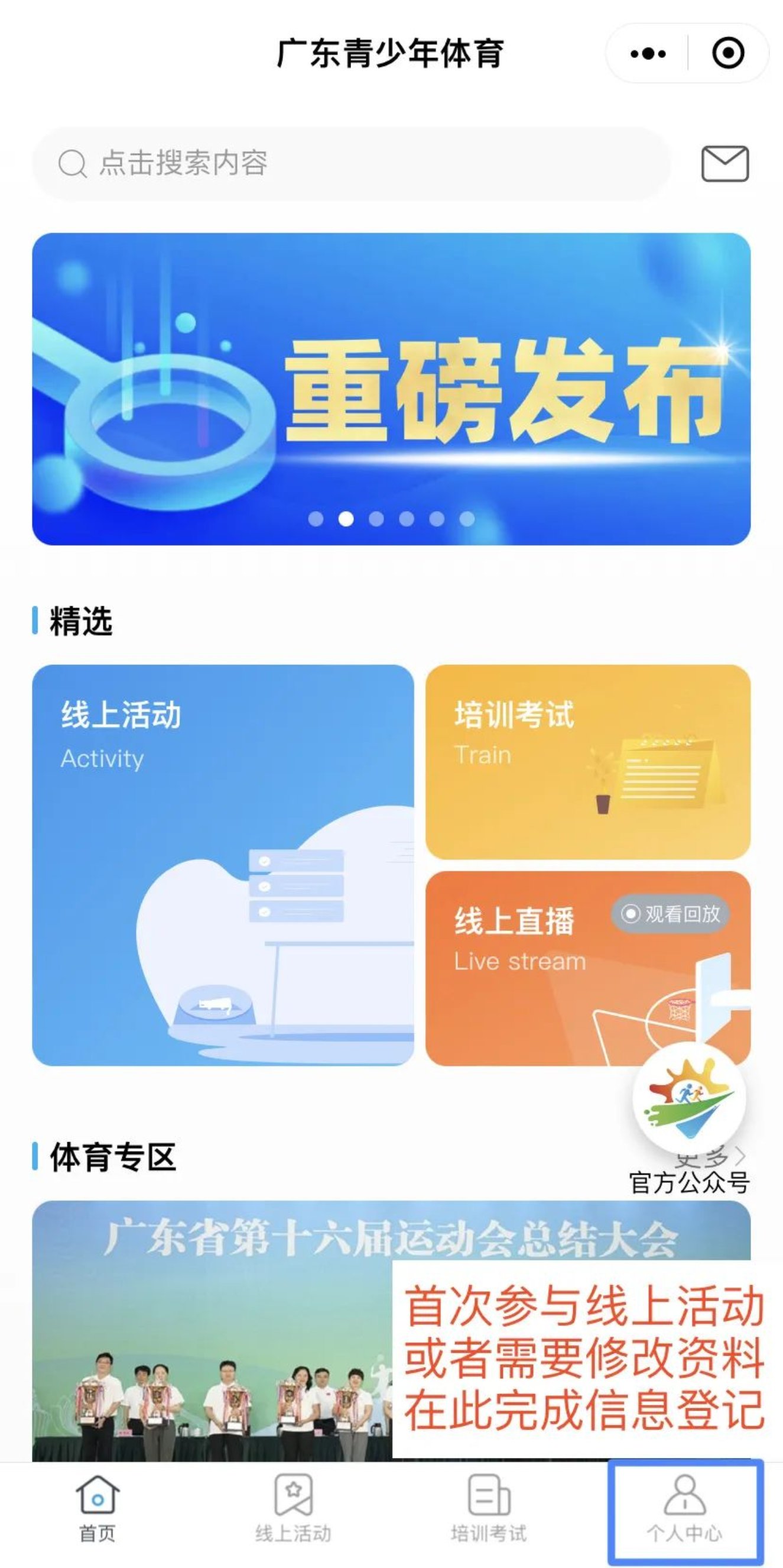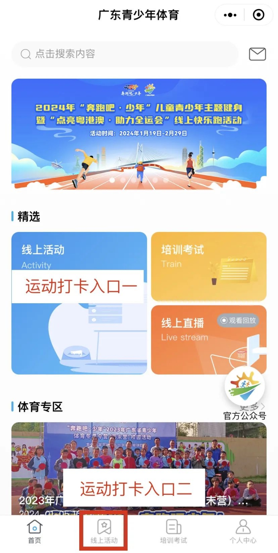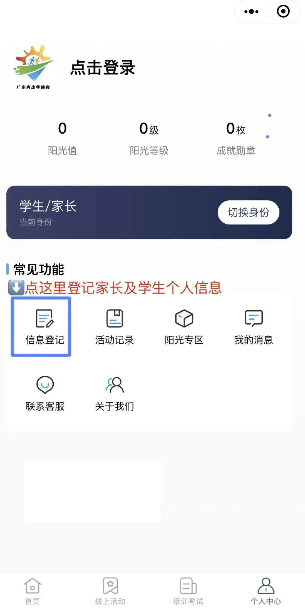 关注“广东青少年体育”微信公众号,从菜单栏“奔跑少年”-“点亮粤港澳全运会”进入活动页面,在“个人中心”-“切换身份”(学生/家长)-“信息登记”准确填写相关信息(学校选择“广东培正学院”)。同学们能顽强拼搏,以友谊第一、比赛第二的原则,赛出风采,赛出成绩!