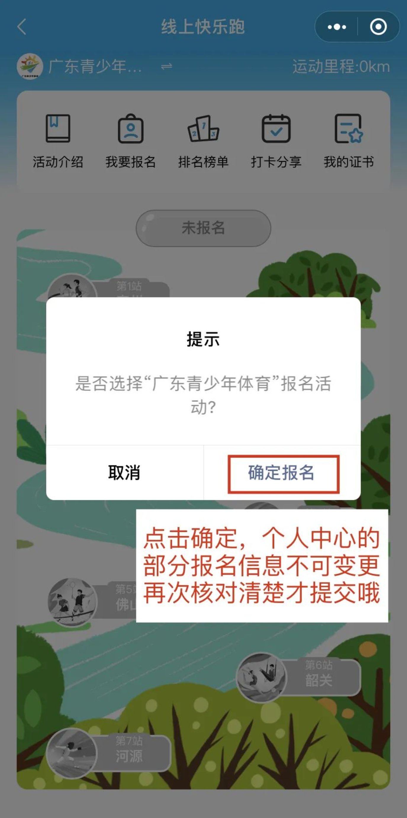 每天6:30-20:30为运动打卡时间,首次开始线下跑步(快走)运动,须点击首页“线上活动”-“线上快乐跑”-“进行中”-“我要报名”(同一微信号报名多位学生时请点击左上角进行切换),确定后点击“开始打卡”。每次运动打卡完毕时,都需点击“结束”键上传本次运动里程数据(注:每次打卡里程数据需满2公里方可上传,一天只能点亮一个虚拟打卡点,点亮后剩余的点数即时清零),如果数据被系统判定有作弊嫌疑,将无法成功记录。