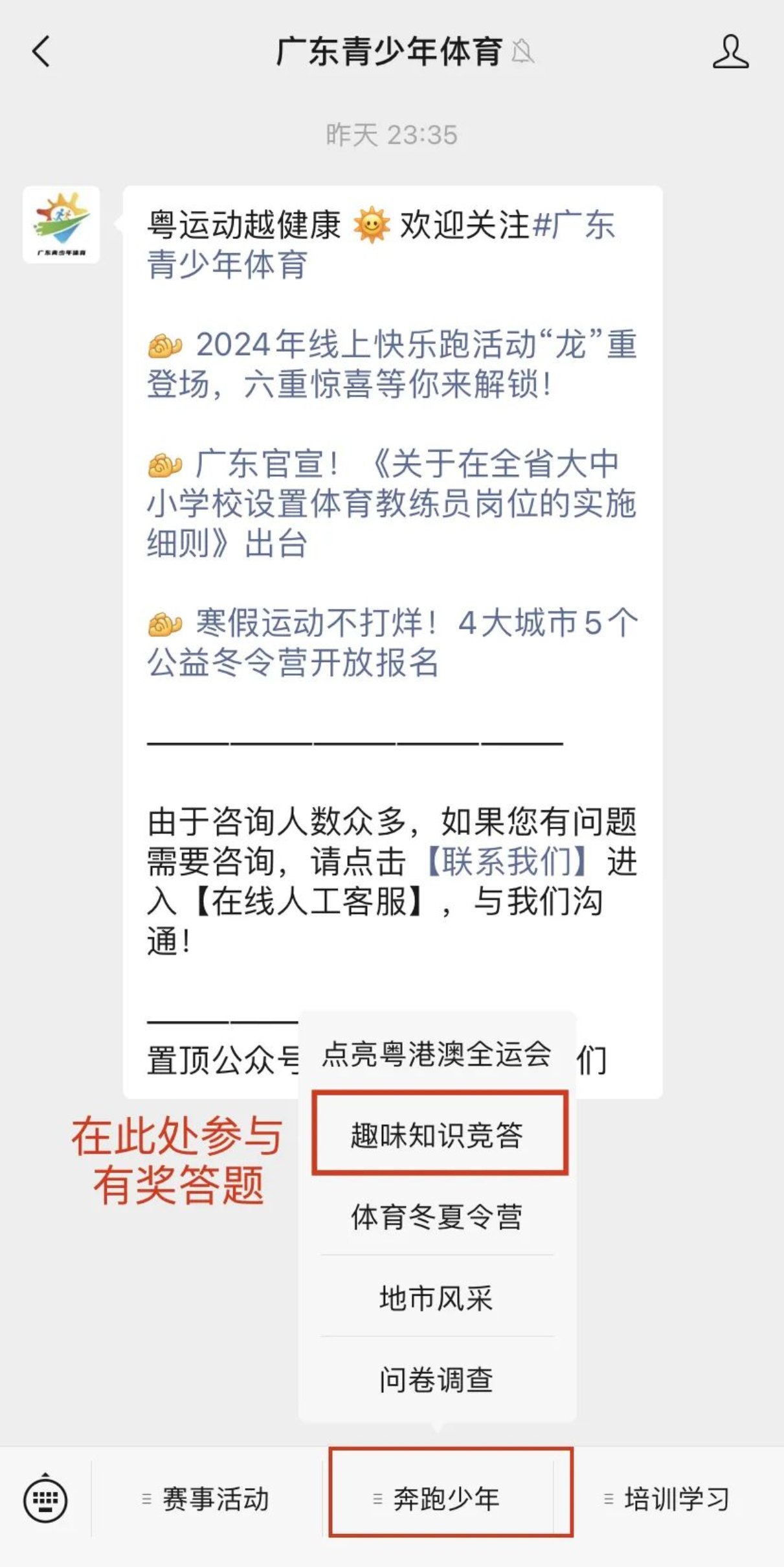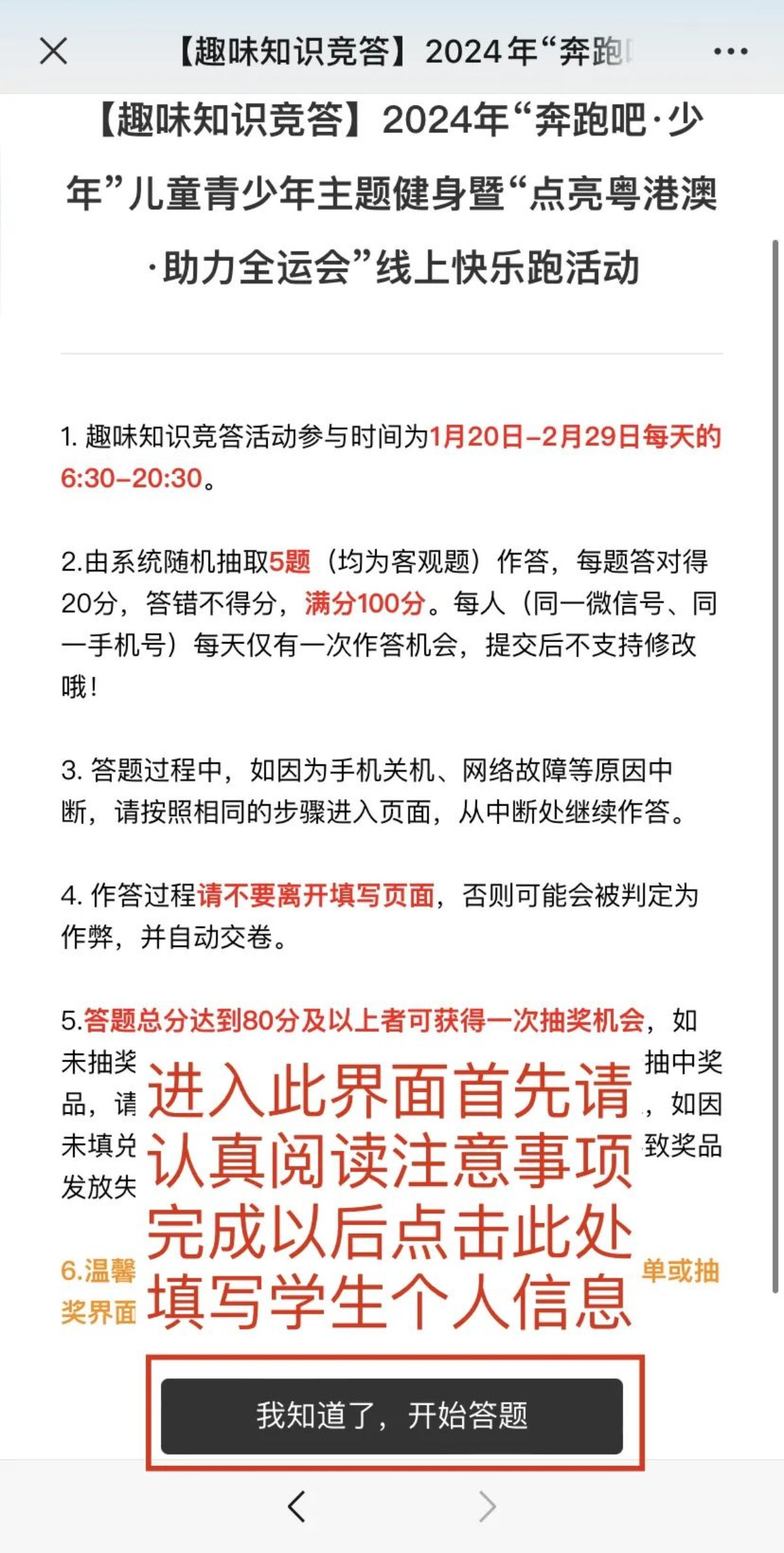 关注“广东青少年体育”公众号,点击菜单栏“奔跑少年”-“趣味知识竞答”-“我要答题”,进入相关界面要准确填写个人信息,即时开始答题。系统会随机抽取5题(均为客观题),参与者每答对一题得20分,答错则不得分,满分为 100分。