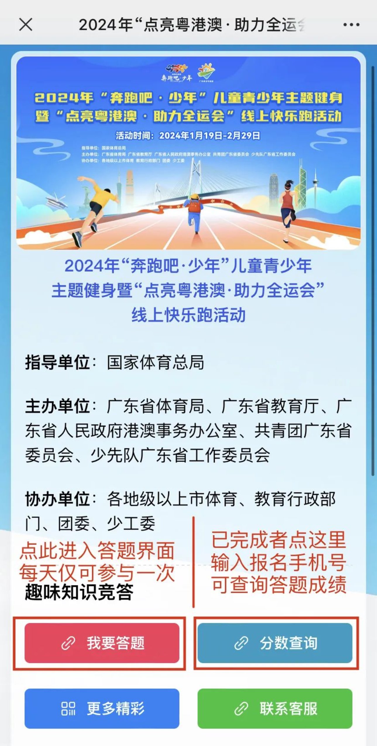 为深入贯彻落实党的二十大报告提出关于“加强青少年体育工作”的重大部署及习近平总书记关于促进儿童青少年健康成长的重要指示要求,2024年“奔跑吧·少年”儿童青少年主题健身暨“点亮粤港澳·助力全运会”线上快乐跑活动以粤港澳共同承办第十五届全国运动会为契机,分别设置幼儿园组、小学组、中学组和大学组的运动任务,引导广大儿童青少年在寒假期间积极锻炼身体,养成运动健身的良好习惯。